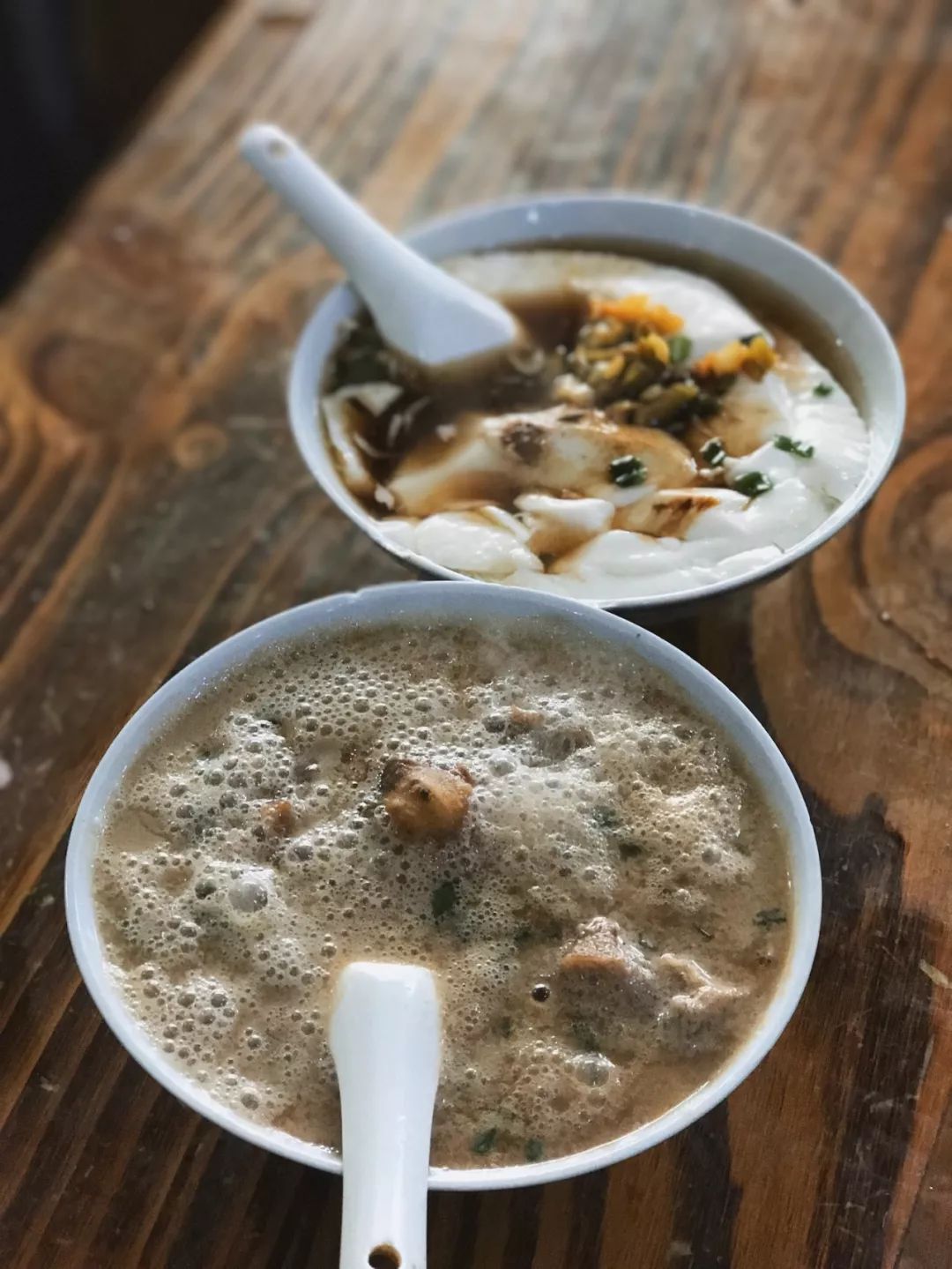 杭州这几年的发展真的太快了,老底子的东西也越来越少,商场里的物价也直逼上海,因此5元一顿就能吃饱吃好的游埠豆浆才更难能可贵。咸豆浆浓稠顺滑,分量也超足;方方的葱油煎饼咬一口满口脆,葱香四溢。店面不大,周围居民穿着睡衣、拖鞋过来买上大饼油条提溜着就走,用游埠豆浆的早餐开启安心自在的一天最合适不过了。